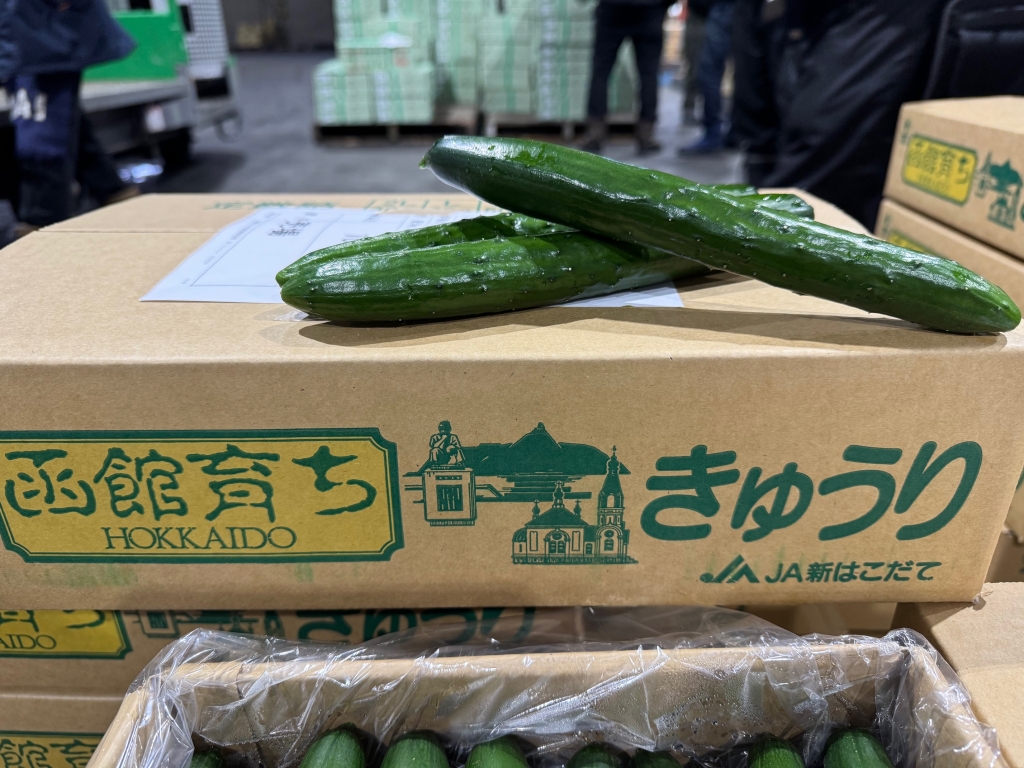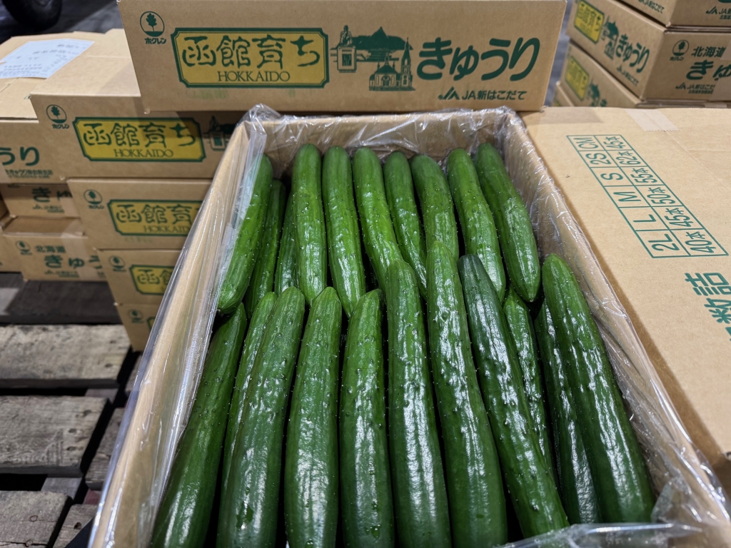 木曜日からは個選ものですがJA新はこだての「きゅうり」の入荷も始まりました。濁川地熱水を活用したハウス栽培の為、雪のある時期から出荷が始まるそうですよ。